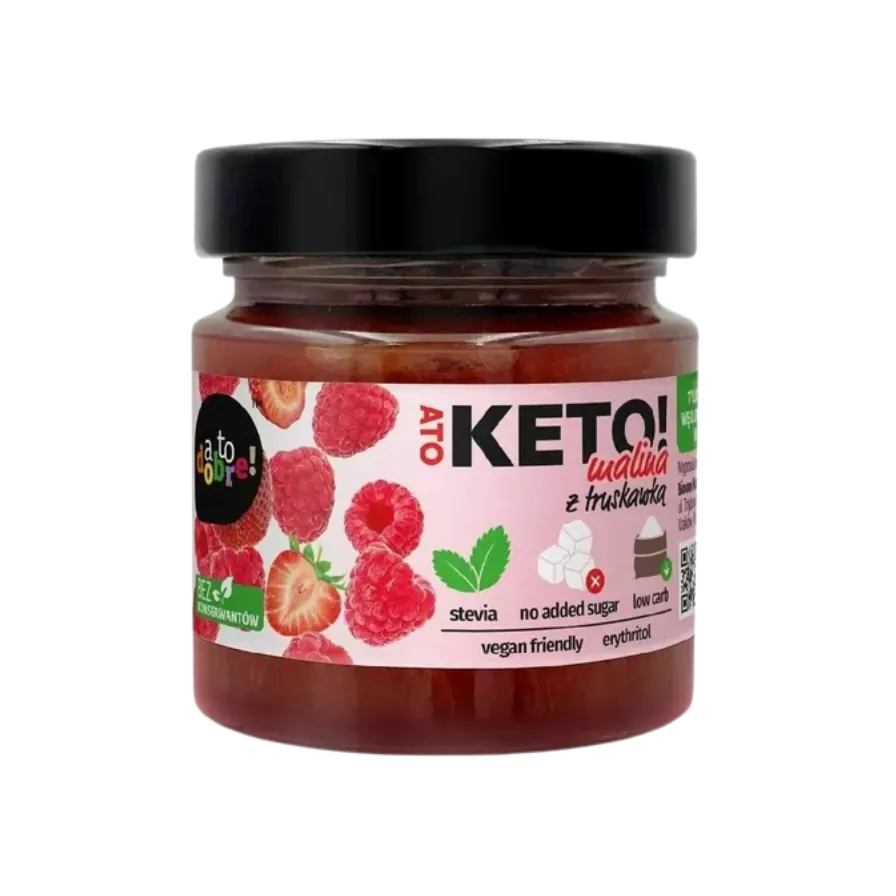 Stiklainis vasariškų, aromatingų aviečių ir braškių. 63 % aviečių ir 35 % braškių, lengvai pasaldintų eritritoliu ir stevija bei sutirštintų pektinu, yra puikus pasirinkimas tiems, kurie laikosi keto arba mažai angliavandenių turinčios dietos. Keto aviečių ir braškių uogienė yra gardus priedas prie mažai angliavandenių turinčių desertų, jogurto, ant keto duonos arba valgoma tiesiai iš stiklainio.