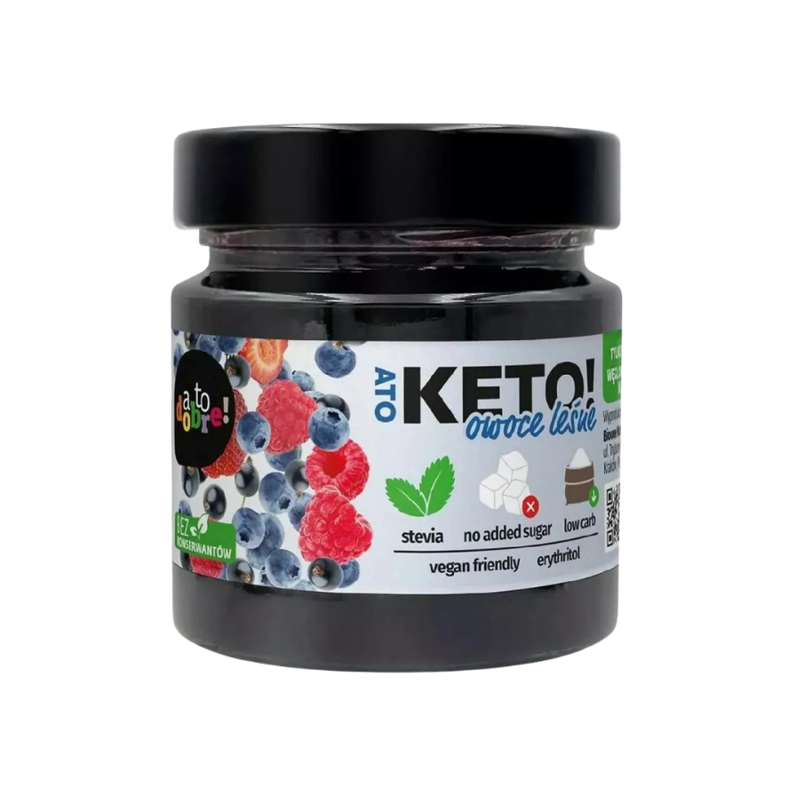 Stiklainyje konservuotos vasaros, aromatingos miško uogos. 69 % mėlynių, aviečių, braškių ir serbentų, lengvai pasaldintos eritritoliu ir stevija bei sutirštintos pektinu – puikus pasirinkimas besilaikantiems keto arba mažai angliavandenių turinčios dietos. Keto miško uogienė yra gardus priedas prie mažai angliavandenių turinčių desertų, jogurtų, ant keto duonos arba valgoma tiesiai iš stiklainio.