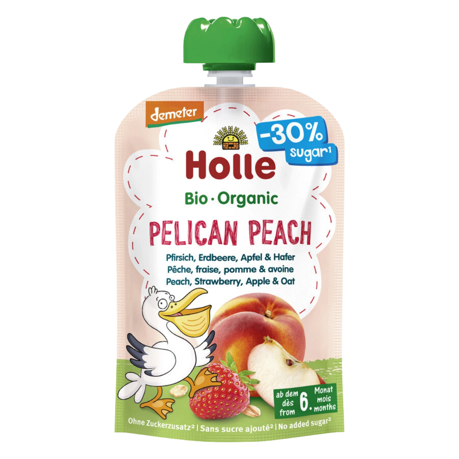 Ekologiška Holle prekinio ženklo vaikams vaisių tyrelė. Sudėtyje sertifikuoti ekologiški ir iš biodinaminio ūkio ingredientai – persikai, obuoliai, braškės ir avižos.
