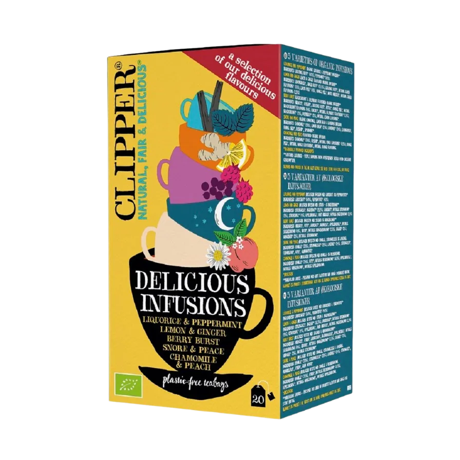 | Sudedamosios dalys | „Sadymedis ir pipirmėtė“ – arbata su saldymedžiu ir pipirmėte. „Citrina ir imbieras“ – arbata su citrinos ir imbiero skoniu. „Uogų sprogimas“ – arbata su juodųjų serbentų ir aviečių skoniu. Sudedamosios dalys: hibiskas*, erškėtuogės*, saldymedžio šaknis*, dilgėlė*, apelsino žievelė*, natūralus juodųjų serbentų skonis (4 %), cikorija*, natūralus aviečių skonis* (1,5 %), juodieji serbentai* (1 %), avietės* (1 %), natūralus citrinos skonis*. (*sertifikuotas ekologiškas ingredientas) „Knarkimas ir ramybė“ – ramunėlių, melisos ir levandų arbata. Ramunėlių ir persikų arbata – ramunėlių arbata su persikų skoniu. Sudedamosios dalys: ramunėlės* (76 %), erškėtuogės*, natūralus persikų aromatas* (6,5 %), apelsinų žievelės*, natūralus mango aromatas*, natūralus apelsinų aromatas. (*sertifikuotas ekologiškas ingredientas) |