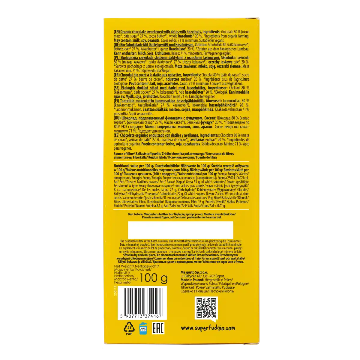 | Sudedamosios dalys | Šokoladas 80 % (kakavos masė*, datulių milteliai*(27 %), kakavos sviestas*), neskaldyti lazdyno riešutai* 20 %. * Sudedamosios dalys iš ekologinių ūkių |