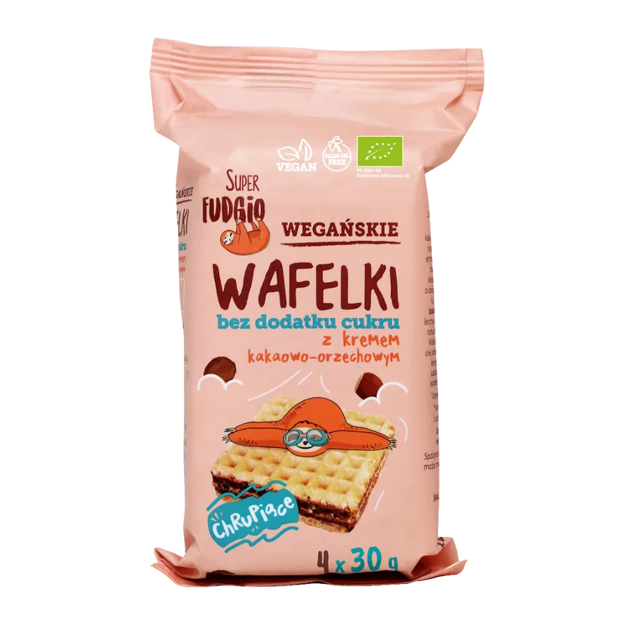 Ekologiški kvietiniai vafliai su kakavos ir lazdyno riešutų kremu be pridėtinio cukraus. Net 65 % produkto sudaro švelnus kakavos–riešutų kremas, saldintas eritritoliu. Traškūs vafliai su sodriu skoniu puikiai tinka ieškantiems saldesnio užkandžio be pridėtinio cukraus.