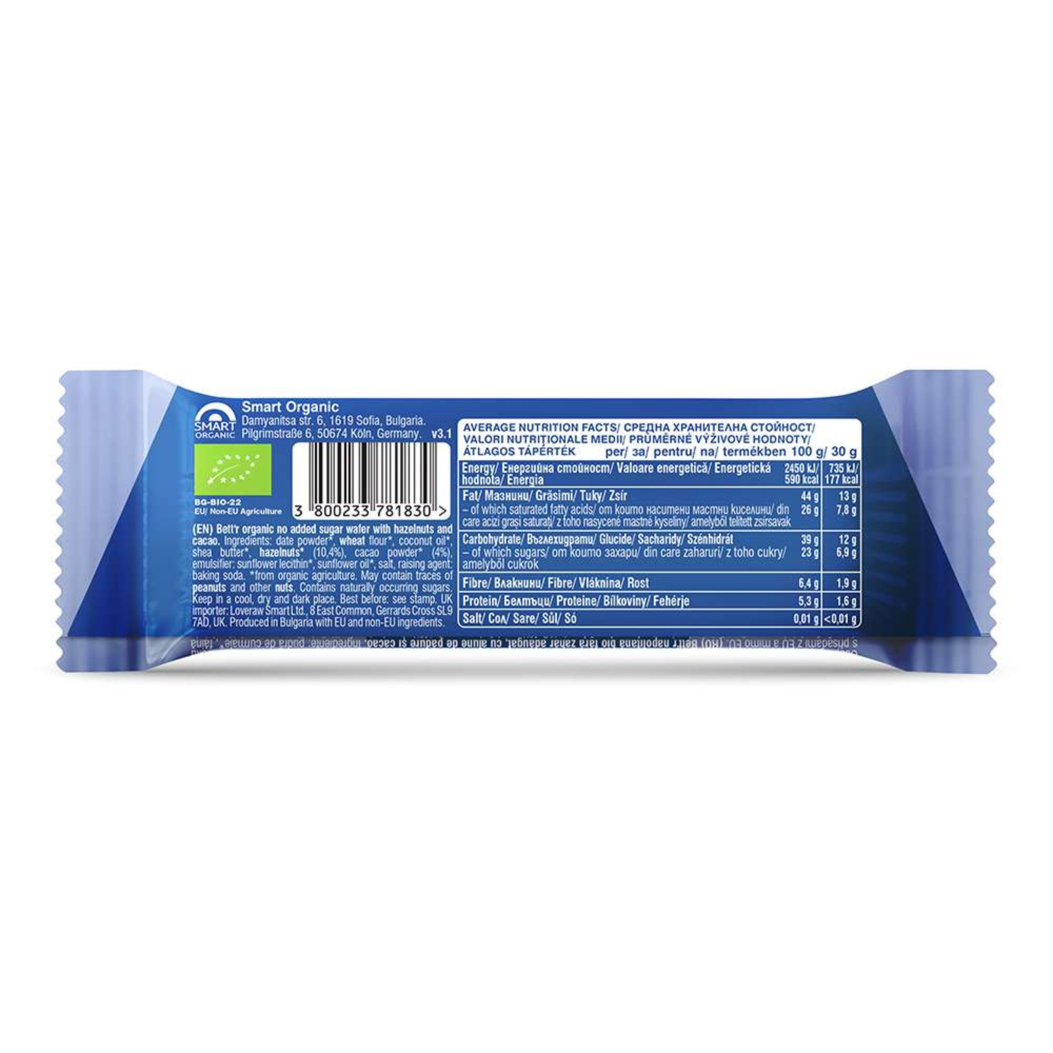 Ekologiškas vafliukas su lazdyno riešutų ir kakavos kremu, be pridėtinio cukraus | BETT’R (30 g)