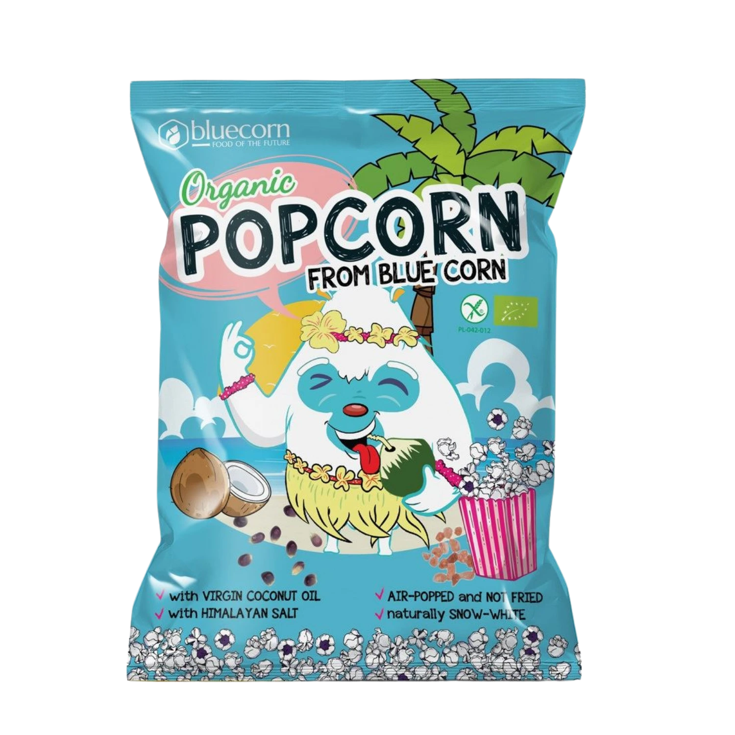 Ekologiški mėlynojo kukurūzo spragėsiai su tyru kokosų aliejumi ir himalajų druska.