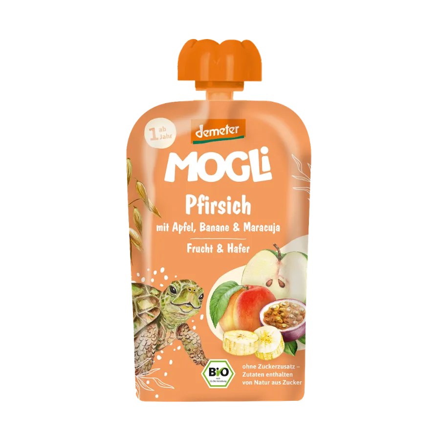 | Sudedamosios dalys | Obuolių tyrė* 44 %, persikų tyrė* 30 %, bananų tyrė** 15 %, pasiflorų sultys** 5 %, avižiniai dribsniai* 6 % (vanduo, viso grūdo AVIŽŲ miltai* 1 %) (*sudedamoji dalis iš biodinaminio ūkininkavimo, **ekologiška sudedamoji dalis). |