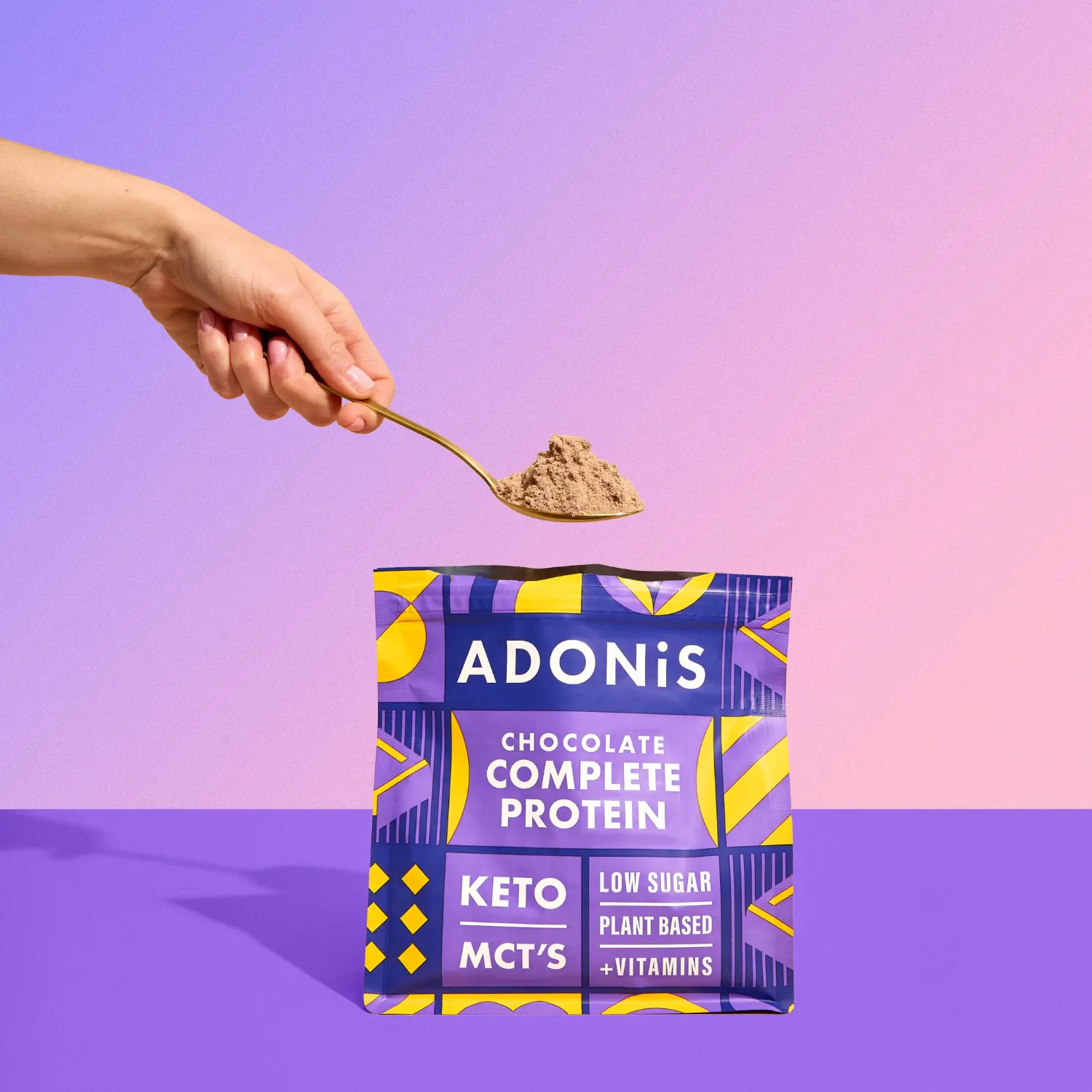 ADONIS šokoladiniai baltymų milteliai – 18 g. baltymų vienoje porcijoje!