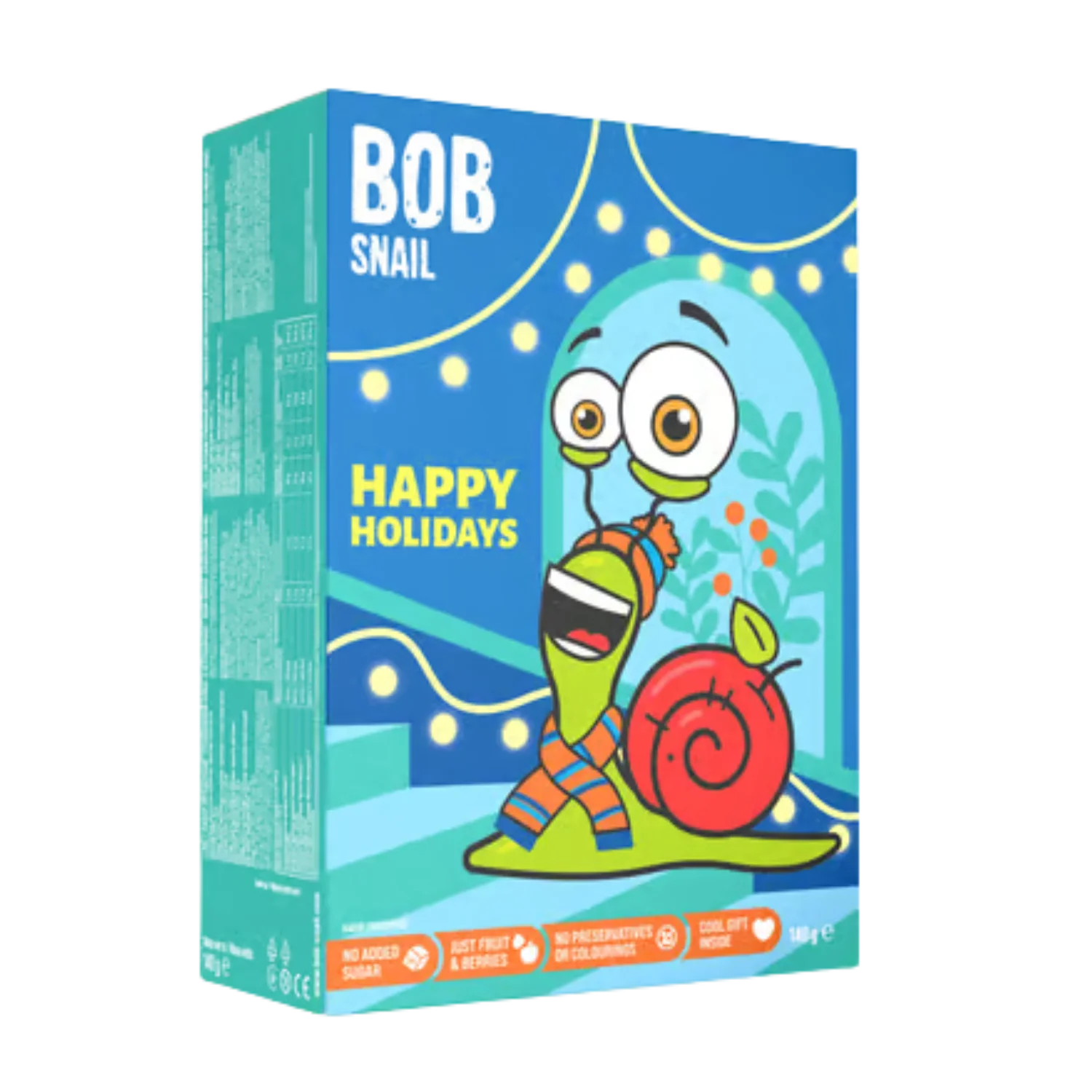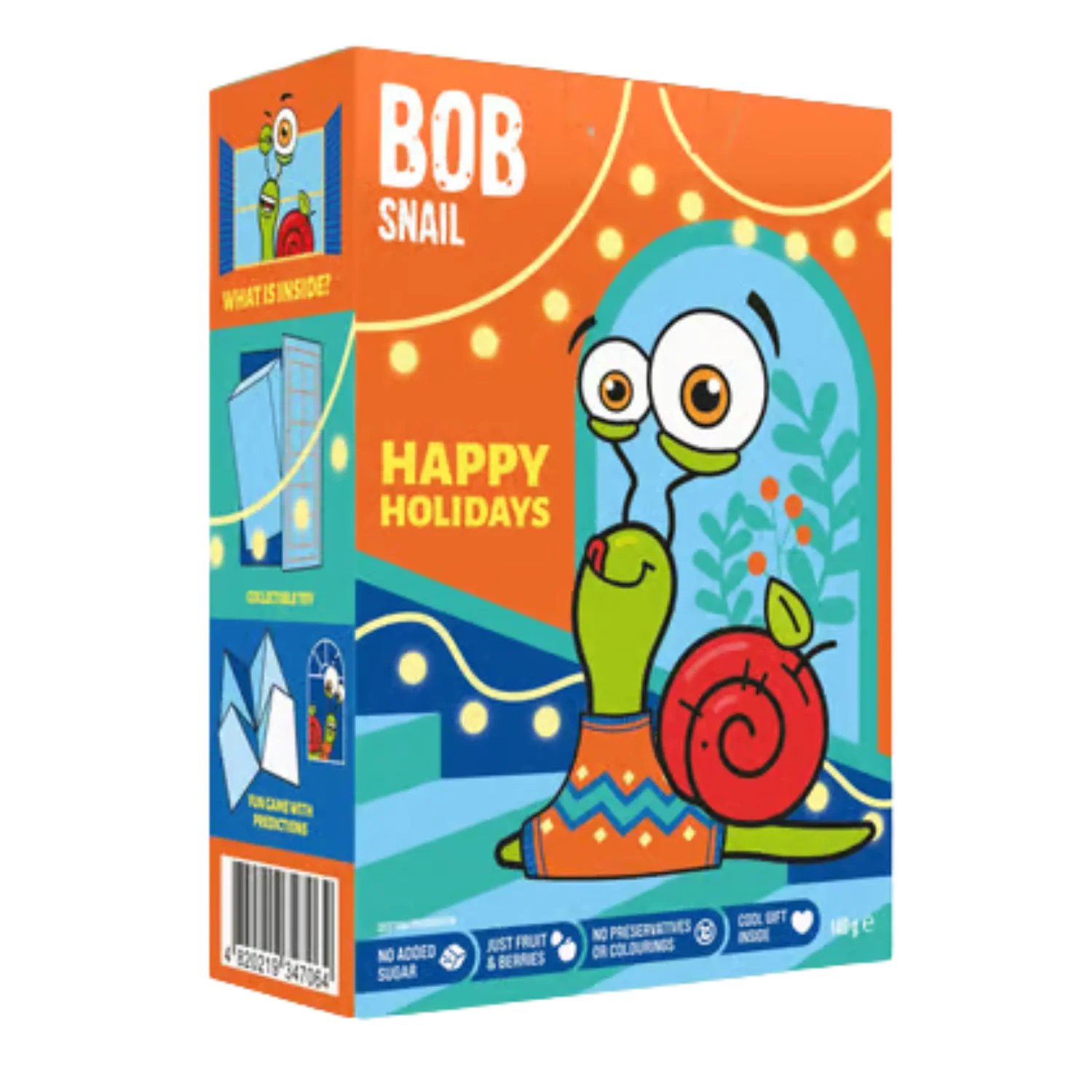 BOB SNAIL HAPPY HOLIDAYS – smagus užkandžių iš vaisių rinkinys su žaismingais lipdukais, mini žaisliuku.